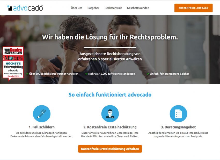 Bei advocado bekommt jeder Rechtsuchende zunächst eine kostenfreie Ersteinschätzung, in der ein Anwalt ihn über seine rechtlichen Möglichkeiten, die damit verbundenen Risiken und Kosten aufklärt. Anschließend bekommt der Mandant ein Festpreisangebot zur Abwicklung seines Falles. Die gesamte Mandatsbetreuung findet über advocado vollkommen digitalisiert statt und ist damit zeit- und ortsunabhängig.